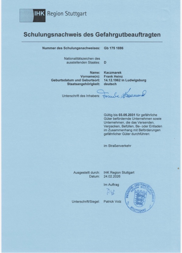 Darüber hinaus absolvieren unsere Fahrer in regelmäßigen Abständen interne Gefahrgutschulungen, um stets auf dem neusten Stand zu sein. Dabei sind auch unsere Disponenten, Ihre ersten Ansprechpartner sowie unsere Gefahrgutbeauftragten in diese Schulungen eingebunden.